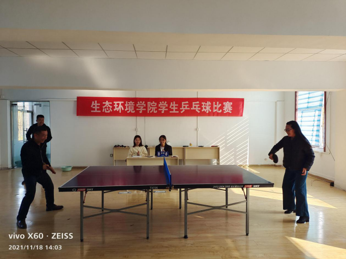 11月18日,生态环境学院成功举办了首届学生乒乓球比赛。刘飞院长与朱明书记的友谊赛拉开了比赛的序幕。