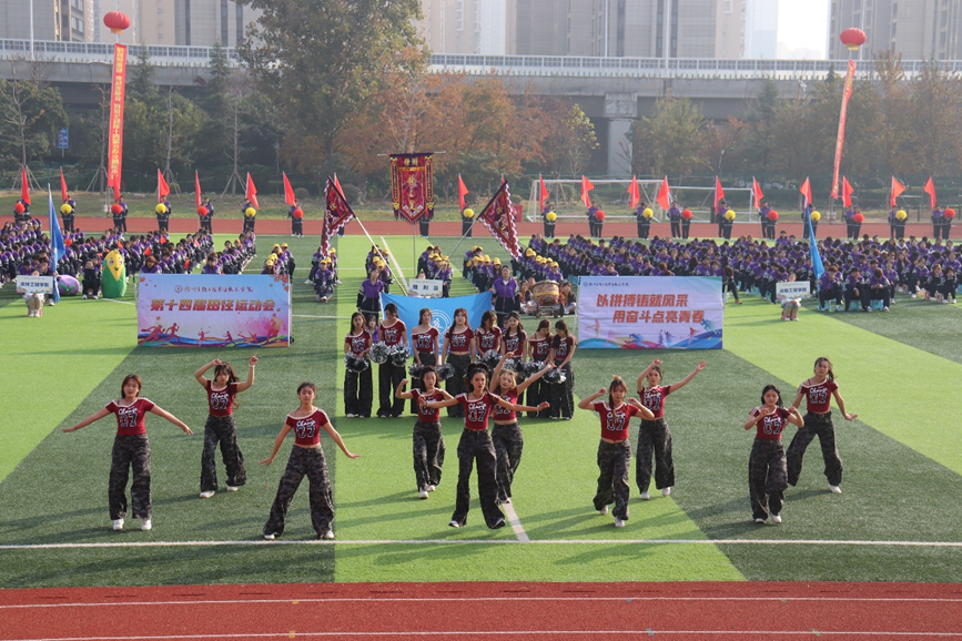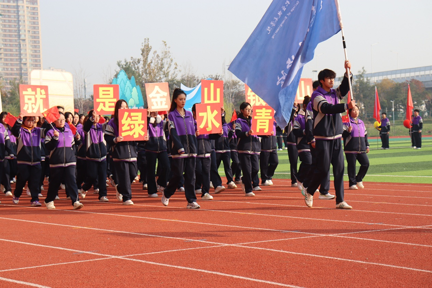 当秋日暖阳铺满田径场,我校第十四届田径运动会的开幕式,以一场青春与信念的盛宴拉开帷幕。各学院方队踩着鼓点依次入场——生态环境学院的队伍里,“绿水青山就是金山银山”的鲜红标语在阳光下格外醒目,蓝底院旗猎猎舒展,步伐里裹着属于生态人的朝气与责任。