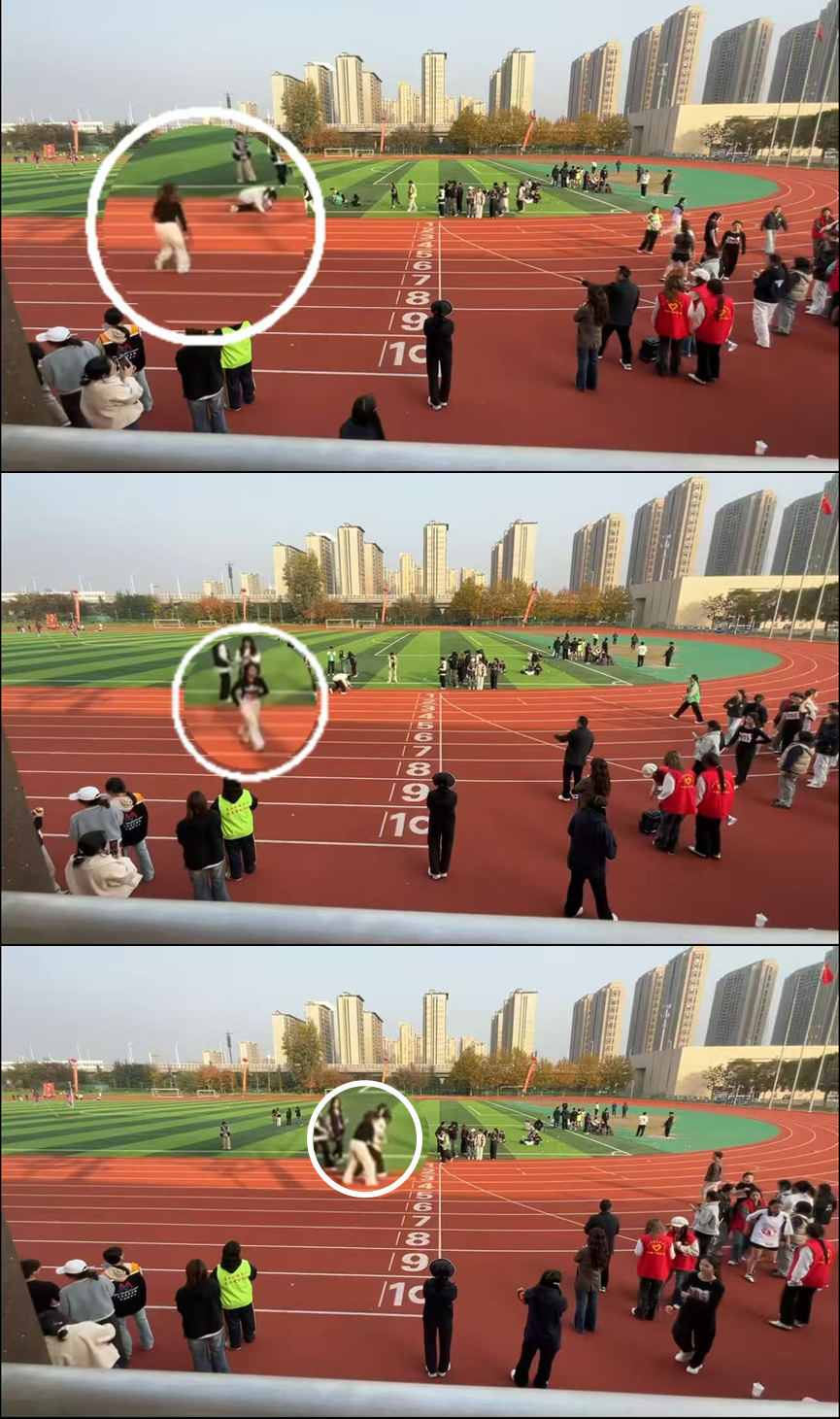 而在女子200米赛事落幕的赛道旁,一幕温柔的场景正悄然抚平竞技的紧绷——刚冲过终点的选手们被疲惫裹住脚步,一位女生的身体突然失去支撑,脚步踉跄着向旁倾斜。没有丝毫犹豫,环境工程2503班的刘倩同学立刻偏离自己的跑道,快步上前蹲下身,小心扶起摔倒的同学,轻声询问其身体状况。在她的搀扶下,该女生尝试继续前进,可刚跑几步便因腿部不适再次踉跄倒地。此时的刘倩,本可转身完成自己的比赛,却毅然选择折返,再次蹲下身稳住同学的身体,一边安抚对方情绪,一边缓慢搀扶着她,一步一步向终点走去。这不过几分钟的举动,没伴着终点处的欢呼,却让场边的目光都软了下来。