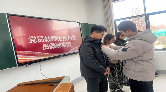 随后,郭中瑞、孙长玲、杨玲三位同志为2025年新发展党员佩戴党徽。党徽承载着沉甸甸的责任,标志着他们正式成为党组织的一员。